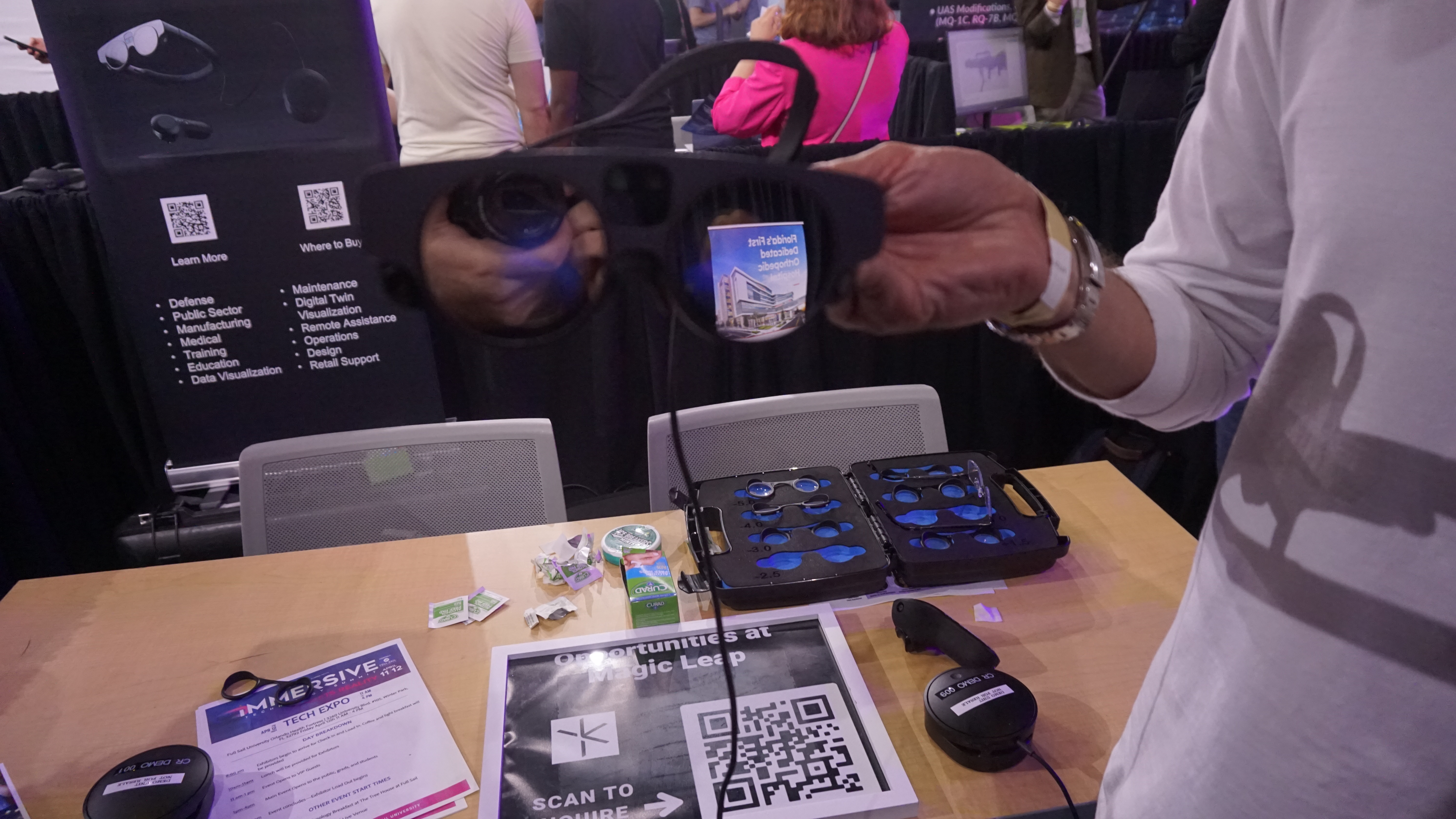 Here! The Magic Leap 2 is a state-of-the-art AR interface. The moment I put it on, I saw specters of another dimension—one of pixels and data. It was my first time using an AR display, and it did not disappoint. I saw digital recreations of its components, a train, a candy stand, and so much more that if I had more time, I would have played with it all day.