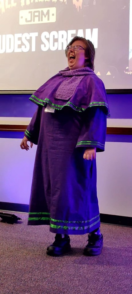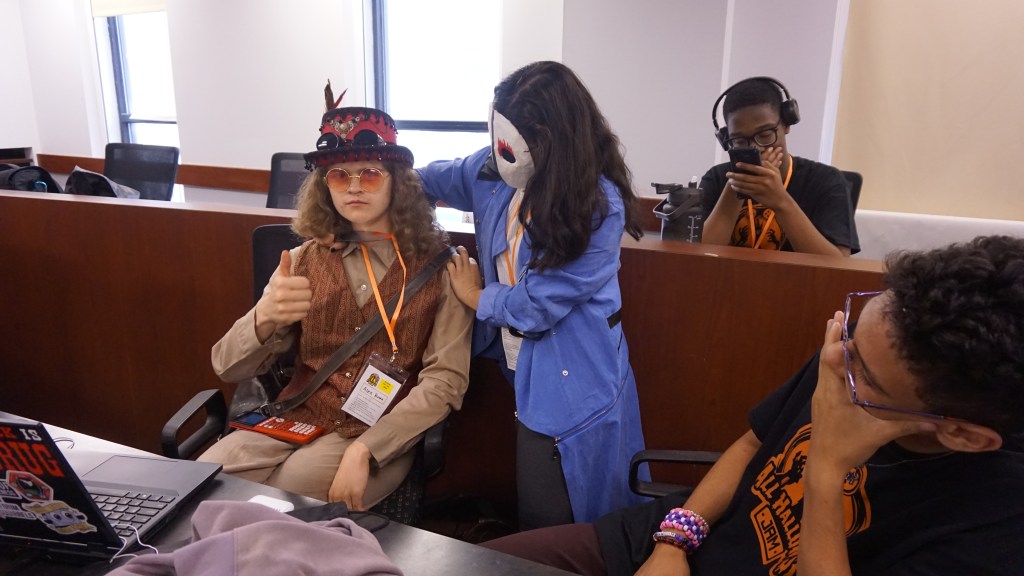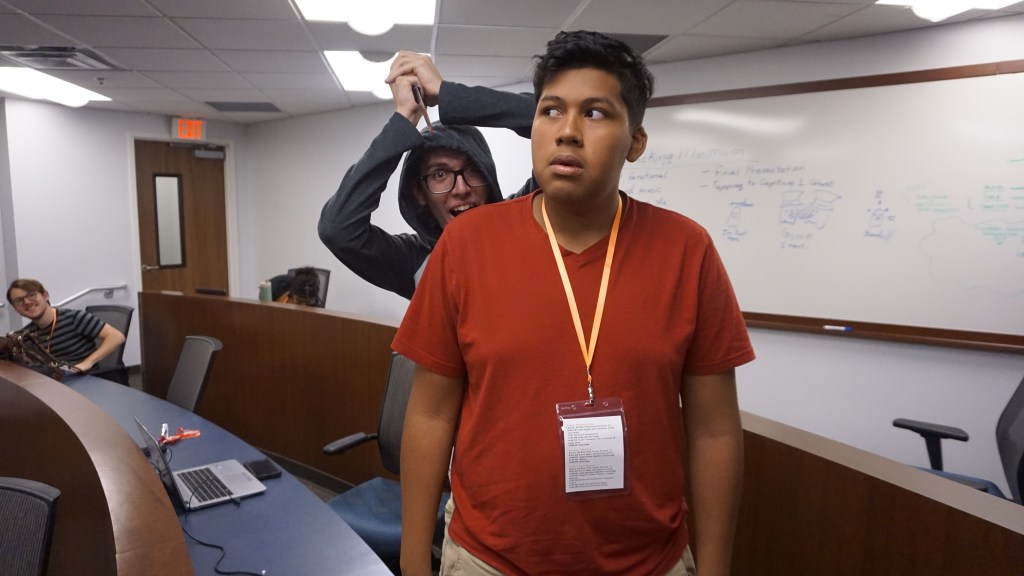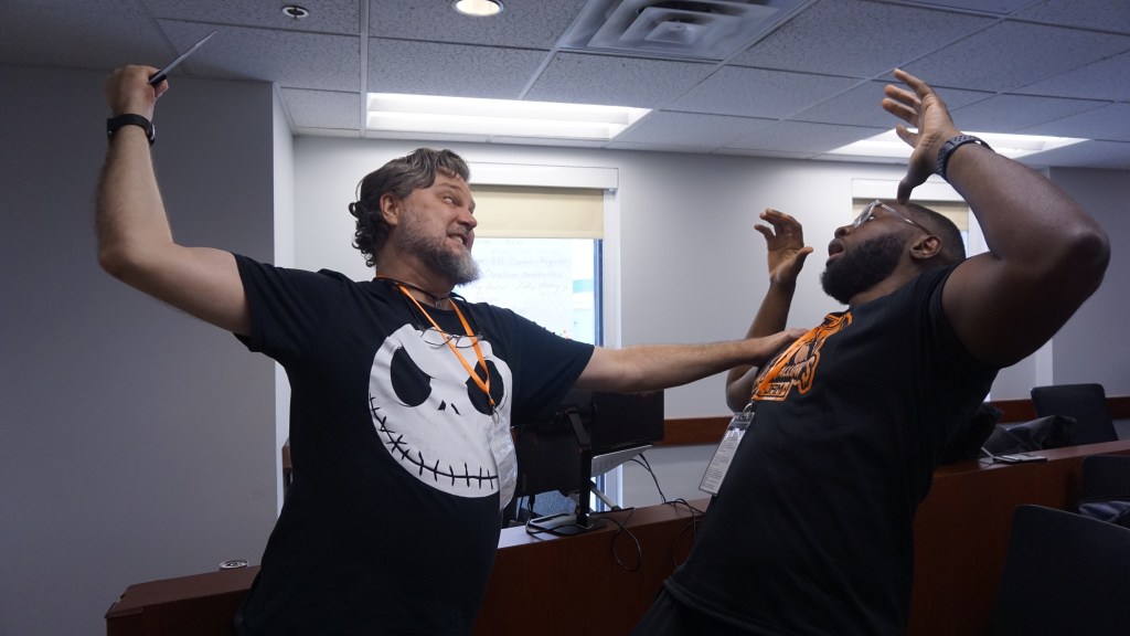 I must clarify a few things before I disclose the winners. Unlike the MeGa Health Jam, there is only one winning team. Everyone was also pressed for time because it was getting late, and Hurricane Harvey was soon upon us. Seriously, the entire city was being evacuated, so the event was on a timer. That said, we all gathered at the auditorium one last time to see the fruits of everyone’s labor and some fun extras. I was actually wearing an old musketeer outfit I bought at a renfaire. I had a sword to go with it, but its sheath broke.